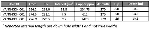 Table 1: Inca Project Vania North Prospect Reported Drill Results