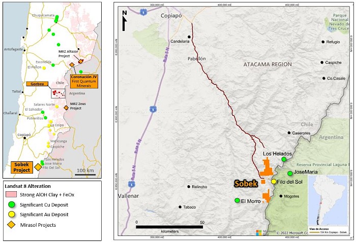 A new copper-gold district is developing in the Sobek area with multiple deposits located in close proximity, including the Filo del Sol mid-Miocene epithermal - porphyry gold-copper deposit 7 km east of Sobek; the Josemaria copper-gold project 10 km to the northeast of Sobek; the Los Helados Porphyry copper-gold breccia system 20 km to the north-northeast of Sobek; and, the giant Eocene El Morro Porphyry copper-gold deposit 16 km to the west-southwest.