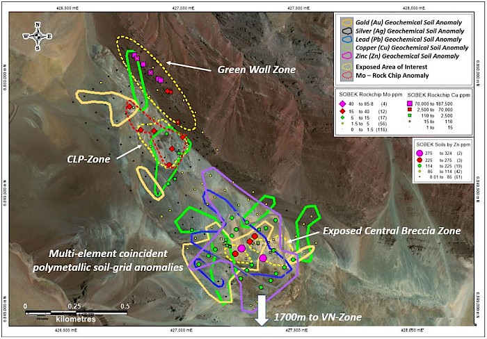 Detailed analysis of the upward transported material in the breccia includes strongly clay phyllic altered (quartz-sericite) and silicified granitic quartz-porphyry clasts, with strong oxide-boxworks, which may indicate a concealed porphyry target at depth. Limited rock chip geochemistry recovered from this breccia shows a “spotty” polymetallic signature with copper>zinc>lead. The detailed grid-based soil survey over the breccia shows a very strong multi-element (polymetallic) geochemical signature with coincident anomalies of lead>zinc>silver>gold>copper in relative order of strength of anomaly. This soil grid survey is currently being enlarged in all directions to fully cover the area of interest.