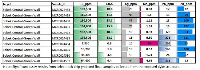 Note: Significant assay results from select rock chip grab and float samples collected from the exposed dyke structure.