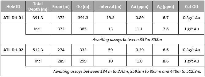 - ATL-DDH-001*: 19.3 m @ 0.89g/t Au from 372m, including 13m @ 1.1g/t Au from 372m