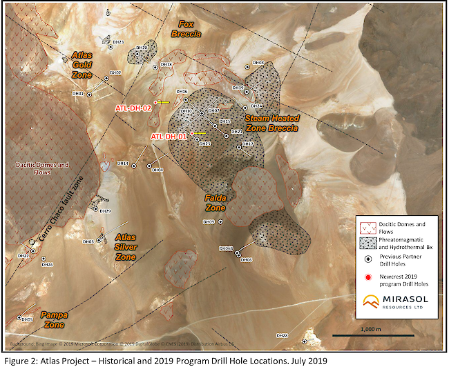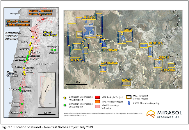 VANCOUVER, BC, July 24, 2019 — Mirasol Resources Ltd. (TSX-V: MRZ) (OTCPK: MRZLF) (the “Company” or “Mirasol”) is pleased to provide an update on the exploration activities completed at its Gorbea Gold project in Northern Chile (Figure 1), by Newcrest Mining Limited (ASX:NCM) (“Newcrest”) under the option and farm-in agreement announced earlier this year. The program was terminated early due to the onset of winter, with two diamond drill holes drilled for a total of 903m at the Atlas target. Drilling was targeting a coincident geophysical, geochemical and alteration anomaly at depth below a barren steam-heated leach cap as well as following up on the results from Mirasol’s previous partner. Initial results have been received with best assay intervals including: