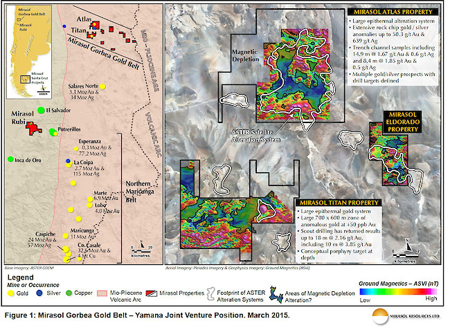 Stephen Nano, the Chief Executive Officer of Mirasol, stated: “We are pleased that Mirasol have partnered with Yamana which has agreed to commit significant resources to the Gorbea Projects where recent exploration by Mirasol has identified several compelling drill targets at the Atlas and Titan projects. Yamana is an important gold producer with operating mines in Mirasol’s focus countries of Chile and Argentina. Yamana has also made a recent construction decision on its high grade gold – silver Cerro Moro project in Santa Cruz province Argentina, where Mirasol maintains a large portfolio of drill ready projects. Further exploration updates will be provided by Mirasol as exploration advances on the Gorbea Projects.”