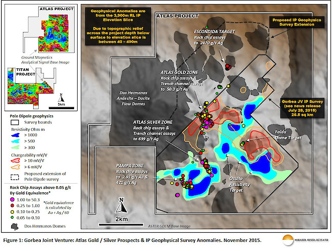 VANCOUVER, BC, November 9, 2015 – Mirasol Resources Ltd. (TSX-V: MRZ, Frankfurt: M8R) (“Mirasol”) is pleased to announce JV partner Yamana Gold Inc. (Yamana) has commenced an aggressive southern hemisphere summer exploration program at the Atlas gold – silver project, one of the nine properties within the Gorbea Belt JV (see news release March 26, 2015). The planned program at Atlas includes phase 1 drilling of a planned 7 priority holes, totaling over 4,000 m, as well as expanding by up to 30 line-km the existing coverage of the deep-penetrating IP geophysical survey (see news release July 28, 2015). Additional trenching is planned to test key gold – silver rock chip and covered geophysical anomalies at the project.