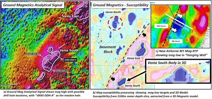The first hole at Vania South is designed to pass through the horizontal resistive layer, which may represent a lithocap, and continue to penetrate the large magnetic anomaly, the MT conductivity anomaly, both of above-mentioned controlling fault structures and the surface geochemical anomaly. The magnetic anomalies appear to reside in the downthrown block (hanging wall) of a large north-northeast structural trend which may separate the basement block on the west side, and the downthrown block on the east side, in a typical horst/graben type structural environment. The Vania South target appears to host characteristics similar to concealed porphyry intrusive bodies, in a very attractive structural setting.