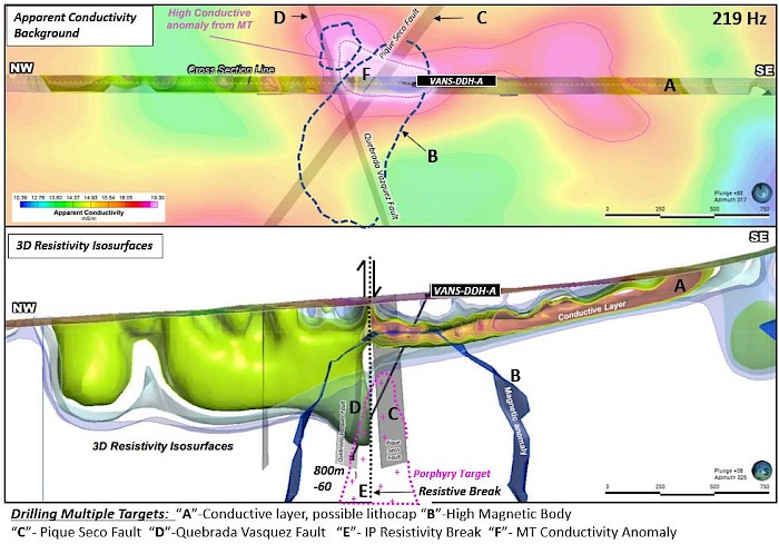Coincident with the northern part of this set of Mag anomalies is a strong conductivity anomaly which was outlined by the Airborne Mobile MT geophysical survey. Vania South is located along the intersection of two very prominent structural trends, the north-south trending Quebrada Vasquez fault and the east-northeast trending Pique Seco fault. A large copper soil anomaly identified from the deep sensing geochemistry (DSG) survey results, resides above the geophysical anomalies in the alluvial/colluvial transported cover.