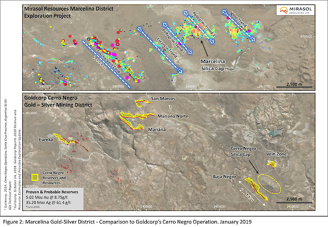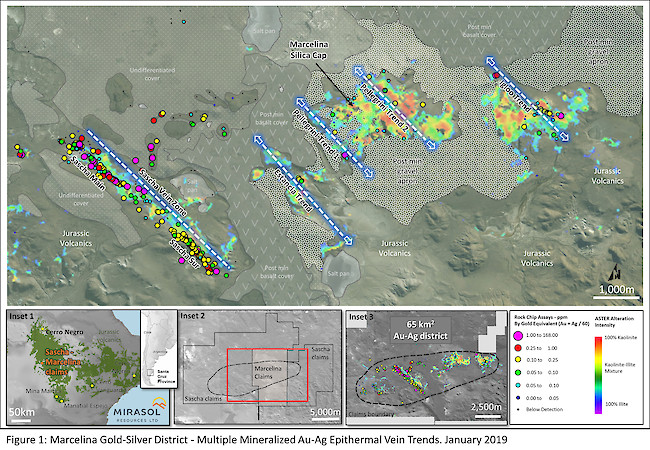 - Multi-kilometre long Au+Ag vein and structural trends, which traverse and outcrop surrounding the Marcelina Silica Cap, display similarities in areal extent and geological setting to the Cerro Negro Silica Cap, where GoldCorp operates the “Vein Zone and Bajo Negro” mines in the world class Cerro Negro Au+Ag Mining District located 100 km to the north of Sascha-Marcelina.