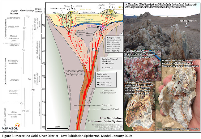 Interpretation of mapped volcanic and sedimentary stratigraphy, Au+Ag and multielement geochemistry and alteration mineralogy shows that different levels of the epithermal system outcrop across the district, exposing what are interpreted to be different levels of the mineralized column of an LSE Au+Ag system. These patterns can be summarized as follows (Figure 2):