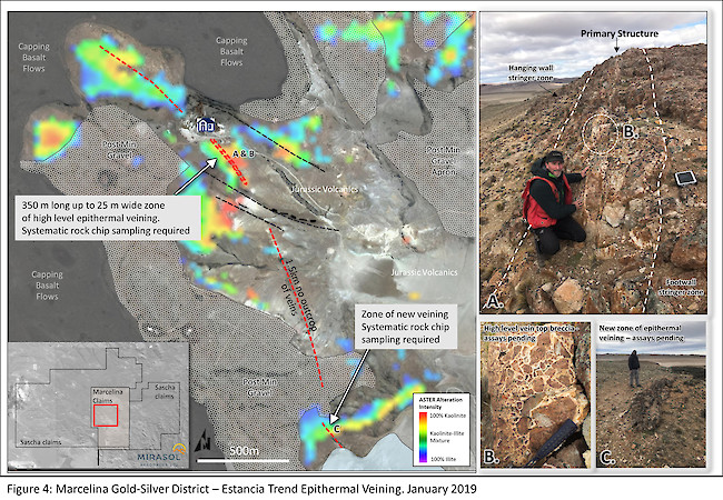 The host rocks at the current outcrop level of the Estancia, Sascha Sur and Igloo trends, are ash and crystal tuffs of the upper middle Jurassic Matilda formation. These volcanics are poor host rocks for large fissure vein formation. However, Mirasol’s stratigraphic mapping at the Marcelina project shows that more permissive host rocks for fissure vein formation, including welded ignimbrite flows of the middle Jurassic Chon Aike formation, are present in the stratigraphy underlying these prospects. Mirasol will use a combination of detailed geological – structural mapping, selective geochemical sampling, alteration vectoring studies and electrical geophysics to refine targets for drill testing.