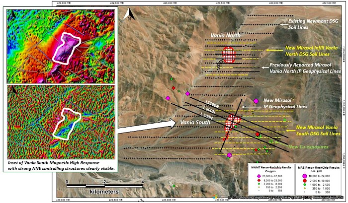 As previously reported, the reprocessing and re-interpretation of the original Newmont ground magnetic (“Mag”) data resulted in the identification of the Vania South anomaly located three kilometers south of Vania North (news release September 7, 2022). At the Vania South target a concealed and very discrete, strong magnetic source exists within the southeast corner of the Mag grid, showing smooth magnetic textures surrounding the main anomaly. Interpretation of the Mag data suggests that this very strong magnetic anomaly may represent a concealed porphyry target, with the magnetic source potentially characterizing the potassic-altered core of an intrusive body and the smooth magnetic border representing the envelope of hydrothermal alteration.