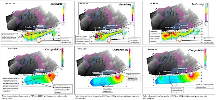 The IP geophysical survey results from these three parallel IP-PDP lines at the Vania South target have delineated a pattern of resistivities and low-to-moderately elevated chargeability anomalies that are consistent with a buried porphyry model. The interpretation of zoning within the system, and the distribution of chargeability and resistivity signatures, fits very well with the original interpretation of zoning from the reprocessed Newmont Mag data. The potential mineralized target highlighted by the zone of magnetite depletion, and also potentially the magnetic core, correlate well with a zone of little or no chargeability. It is noteworthy that some mineralized porphyries exhibit little or no chargeability associated with the mineralized zone.