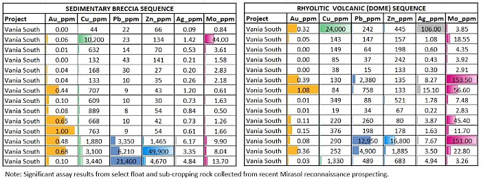 Table 1: Vania South – Recent Select Float and Sub-crop Rock Sample Results