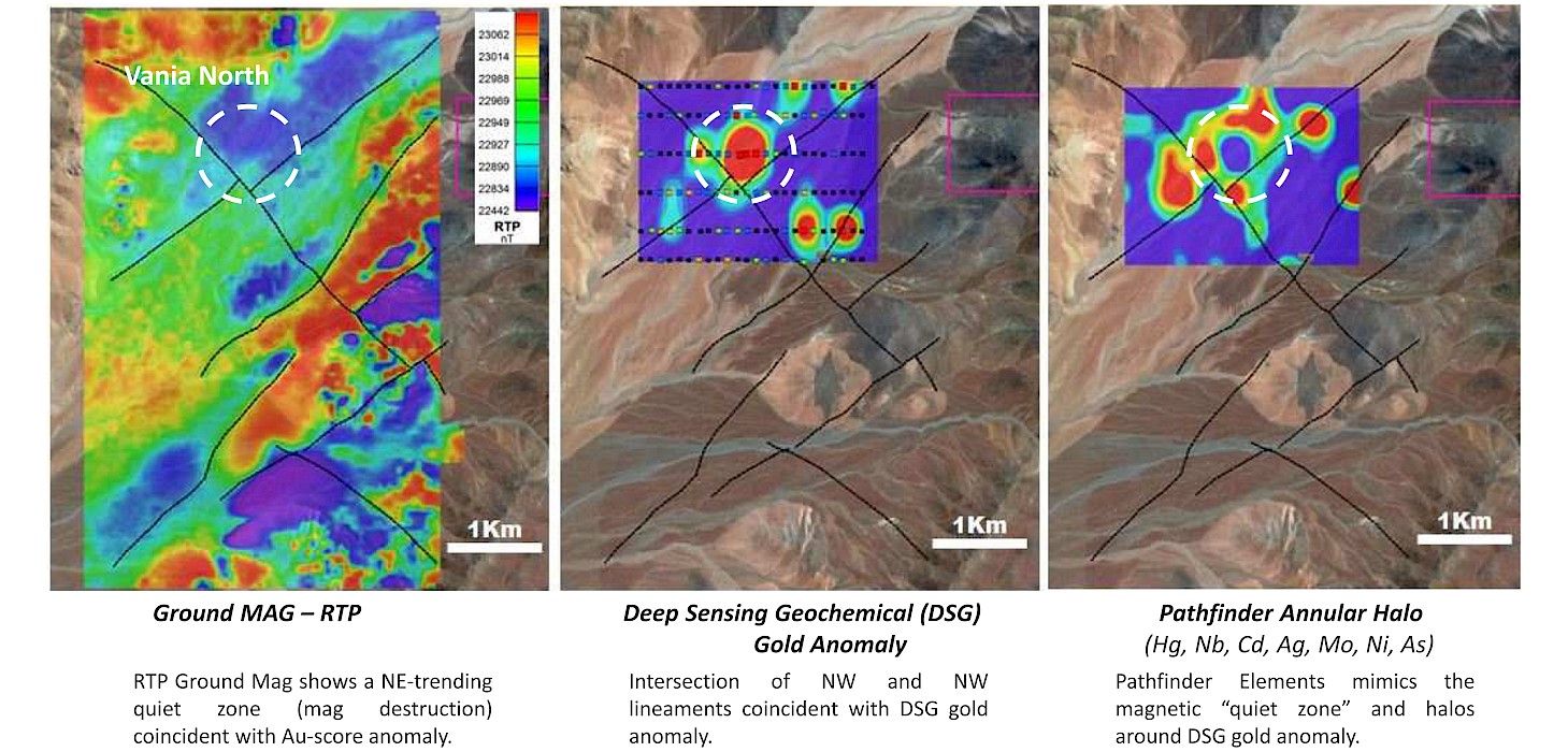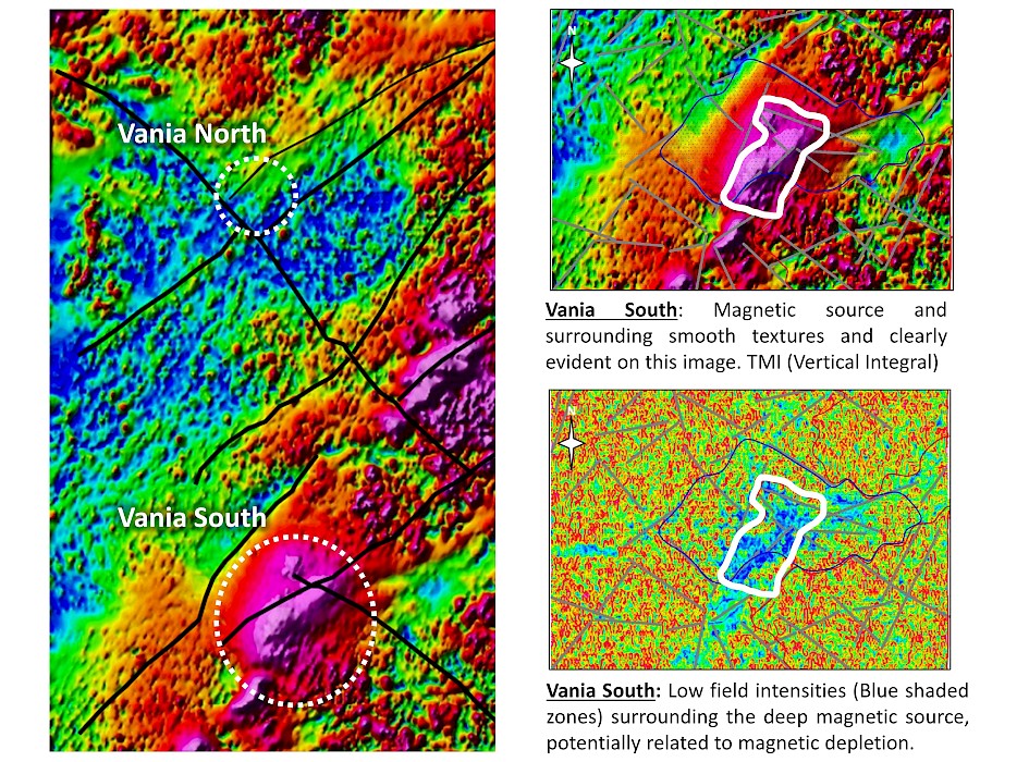 The reprocessing and interpretation of the magnetic data has resulted in the identification of a second compelling prospect three kilometers south of Vania North. At the Vania South target a very discrete and strong concealed magnetic source exists within the SE corner of the Mag grid, showing smooth magnetic textures surrounding the main anomaly. Interpretation of the magnetic data suggests that this may be a very strong magnetic anomaly that could represent a concealed porphyry target, with the magnetic source potentially characterizing the potassic-altered core of an intrusive body and the smooth magnetic border representing the envelope of hydrothermal alteration.