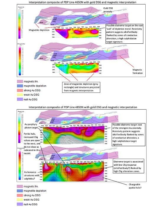 Mirasol’s subsequent reprocessing and reinterpretation of the Newmont magnetic data clearly delineates a prominent NE-SW trend of magnetic depletion, coincident within a long, shallow topographic valley. The magnetic depletion and low resistivity, identified from the recent IP survey, suggests that the rocks along this trend may have been subjected to acid-sulphate leaching and may contain sections of vuggy silica, which are deemed to be prospective zones for late-stage mineralizing events.