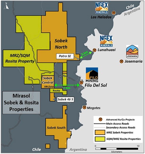 Mirasol staked the Sobek Project in 2016 based on prospective local geology and attractive structural architecture prior to the 2021 discovery of the high-grade feeder zone at the Filo del Sol gold-copper deposit and the 2023 discovery of Lunahuasi. The continually expanded and consolidated Sobek Project is located on the same regional N-S trending structural corridor and just 3 km to the west of the Filo del Sol deposit and 3 km to the southwest of NGEx Mineral’s discovery at Lunahuasi.