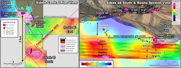 The emerging porphyry target at Sobek 46 South, is associated with a very large (over 1 kilometer by 1 kilometer) aerial geophysical response sourced from both airborne magnetics and MT surveys. Prospecting campaigns have reported copper mineralization in rockchips directly above the subsurface Mag and MT geophysical anomalies. The systematic soil sampling has also started to define what appears to be a strong and coherent copper/moly/gold soil anomaly coincident with the rockchip geochemistry overlying the geophysical responses at Sobek 46 South (news release dated May 13, 2024).