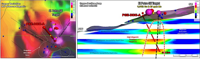 Figure 2: Sobek North Potro SE Target - Airborne RTP Magnetic Anomaly & Longitudinal Section (with current drill hole location and proposed length, cylindrical shaped magnetic feature with 3D mag-susceptibility depth slices and elevated surface copper geochemical results)