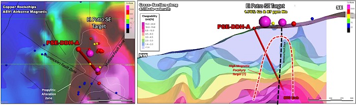 The Potro SE target is a cylindrically shaped magnetic high anomaly previously identified from an airborne-magnetics survey supported by coincident copper-moly geochemical anomalies sourced from both soil grid and rock chip sampling (news release dated May 13, 2024). An Induced Polarization (IP), Pole-Di-Pole (PDP) geophysical chargeability response is also spatially associated with the Potro SE cylindrical magnetic high target and located at the intersection of two productive faults the Maranceles Fault and the Ventana Fault (which continues 3 kilometers north-northeast to Lunahuasi). These concurrent geological, geophysical, geochemical and alteration attributes reinforce Potro SE’s potential as an attractive concealed porphyry system.