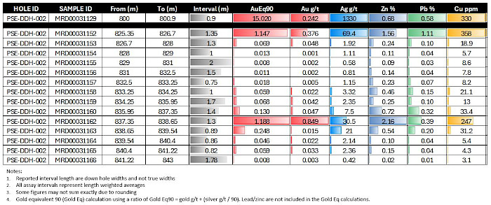 - 3.59m (835.95 to 839.54m) with 0.54 g/t gold Eq (0.33 g/t gold, 19.2 g/t silver) and 1.97% zinc and 0.31% lead.