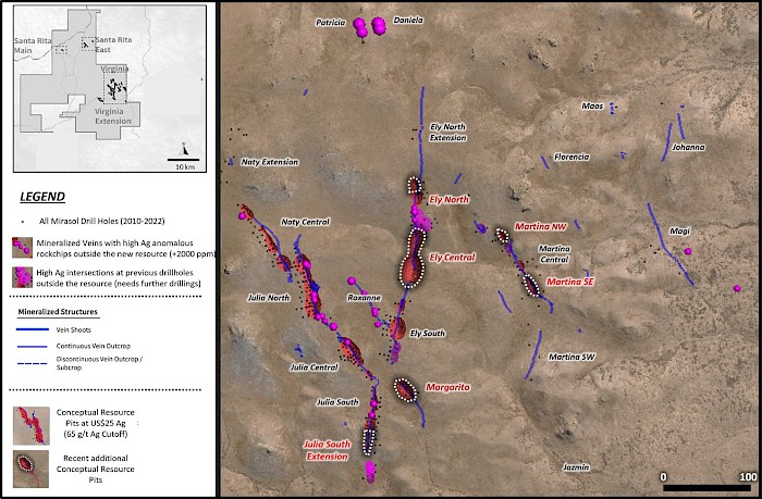 “The Virginia Silver Project is a cornerstone asset within Mirasol’s large portfolio of advanced stage exploration projects in Chile and Argentina. The overall 30% increase in silver ounces in the updated Resource estimate from limited new drilling underscores the project’s potential,” Mirasol’s President, Tim Heenan, commented. “High-grade silver grab samples collected along strike and also from prospecting multiple nearby parallel exposed veins highlight the significant upside potential outside the current Resource.”