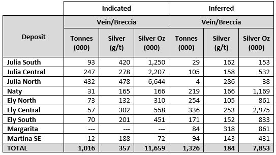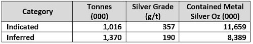 The Resource contained within nine outcropping veins of high-grade silver mineralization (Table 1) consists of: