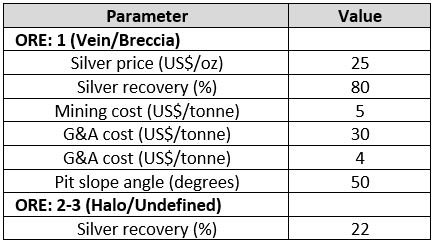 - Mineral Resources are estimated using a silver price of US$25 per ounce. Mineral Resources are estimated using an average recovery of 80% for silver hosted in Vein/Breccia and 22% for silver hosted in Halo/Undefined from preliminary metallurgical studies.