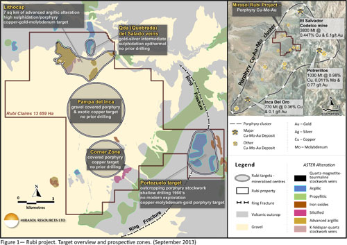 The Rubi Project was identified and staked by Mirasol through its Chilean project generation program (see news releases of November 26, 2012 and June 12, 2007). Rubi is located within the premier porphyry belt of northern Chile that hosts many world class porphyry copper deposits. The Rubi Project is centered within a regional cluster of large, gold-bearing porphyry copper deposits (Figure1) including the 3.8 Bt El Salvador and 1Bt Potrerillos districts as well as the 770 Mt Inca Del Oro mine development.