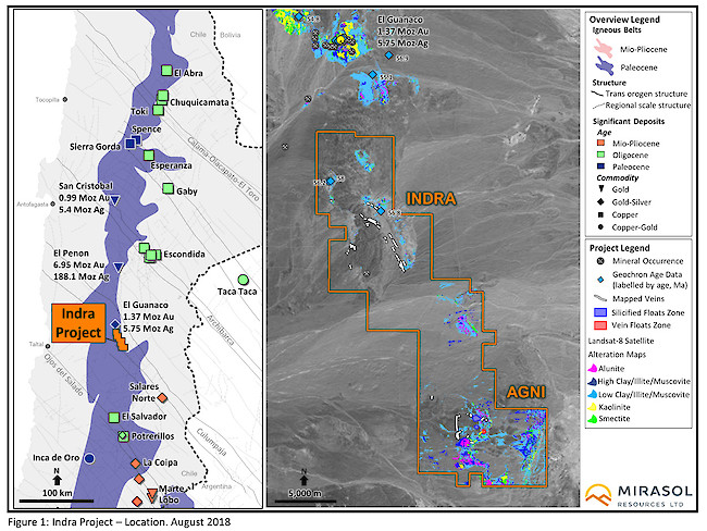 VANCOUVER, BC – August 30, 2018 — Mirasol Resources Ltd (TSX-V: MRZ), (OTCPK: MRZLF), (the “Company” or “Mirasol”) is pleased to report on progress at the Company’s 100% owned 21,000 ha Indra epithermal precious metal project, located 5 km south of the 1.37 Moz[1] El Guanaco gold mine in northern Chile.
