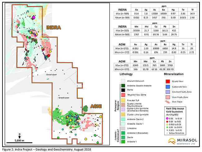 Mirasol and HOC are currently designing the first phase Indra exploration program that will include detailed geological mapping, rock chip sampling, alteration vectoring studies and ground magnetics. It is anticipated that exploration will commence at the project in the 4th quarter of 2018.