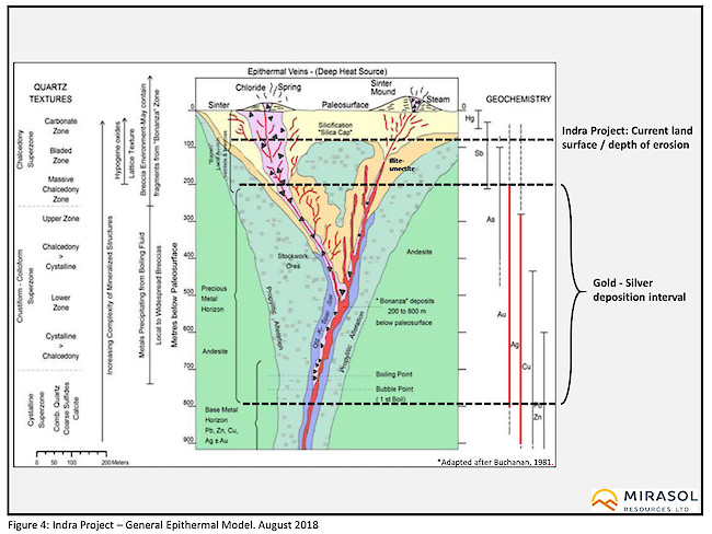 Based on Mirasol’s knowledge of this deposit class and ore deposit models developed from studies of epithermal deposits in Chile and other parts of the world, Indra is interpreted as representing the upper levels of a large epithermal system, where high-grade Au-Ag mineralization may be preserved at depth beneath the outcropping Indra and Agni alteration and vein zones. This interpretation is supported by the presence of “Indra” like carbonate – silica veining, peripheral to and overlying gold – silver mineralization in the El Penon district[8], and overlying the ore zone in the multi-million ounce HOC Arcata gold-silver mine in Peru that has produced in-excess of 390,000 oz Au and 200 Moz Ag9.