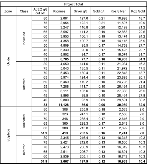 In addition to the total project resource tabulation (Table 1) at 33 g/t silver equivalent cut-off (oxide) and 51.9 g/t silver equivalent cut-off (sulphide), resources have been tabulated at a series of cut-off grades (see Technical Appendix). This enables construction of grade-tonnage curves which assist in determining the effect on the resource estimates with changes to the cut-off grade. The grade-tonnage curves show the relative importance of the different mineralization types and categories at the present time (see Figure 1 ). The current dominance of oxide resources, considering both tonnes and silver ounces, is clear, but geologically the potential for adding sulphide silver ounces, especially at La Morocha, is of great interest.