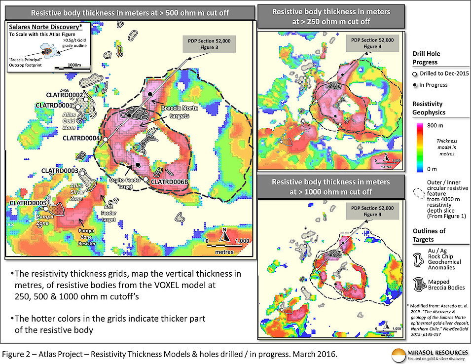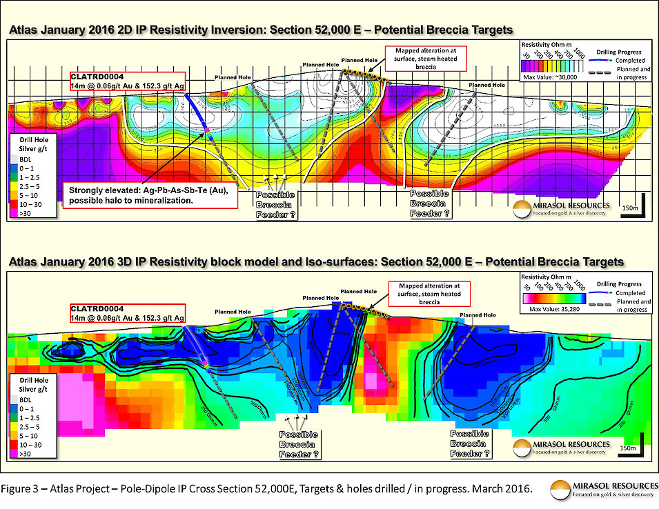 Yamana plans to drill an additional 2,500 m during the January to March 2016 quarter at Atlas. This campaign will be directed to test some of the newly recognized geophysical targets and to extend drill hole CLATRD0004 testing for higher grade mineralization associated with the anomalous Au-Ag intersected in this hole to date. Further updates will be reported as assay results are received by Mirasol.