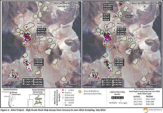 Mirasol closed the southern hemisphere 2013-14 summer exploration season in early June. At season’s end approximately 80% of the +25 sq. km Atlas alteration system had been systematically reconnaissance sampled with over 2,479 surface rock chip (Figure 1) and 334 stream sediment samples collected this season (also see news release of February 26, 2014). These results have expanded the dimensions and upgraded the potential of the Atlas Gold Zone (AGZ) and the Atlas Silver Zone (ASZ) prospects as well as defining a large gold-silver anomaly at the new Pampa prospect.