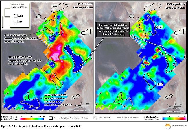 A 5.4 sq. km, 100 to 200 m line-spacing IP electrical geophysical survey (Figure 2) has been completed over the centre of the alteration system, identifying a series of resistivity anomalies associated with surface alteration and rock chip/trench gold-silver assays. These anomalies have locally returned very high resistivity readings in the range 5,000 to 15,400 Ohm/m and in some cases form part of large, open-ended resistive zones in excess of 1 km in strike length. In epithermal systems such as Atlas, resistive anomalies of this nature can map the distribution of hydrothermal silica accumulations that can be associated with precious metal mineralization. At Atlas the resistivity anomalies associated with the AGZ, Pampa prospect and a larger, high intensity covered resistive anomaly in the northeast of the survey area are considered by Mirasol to represent priority drill targets.