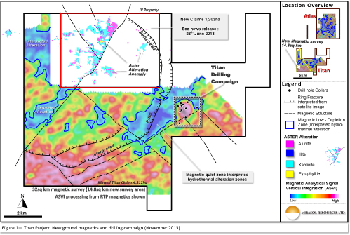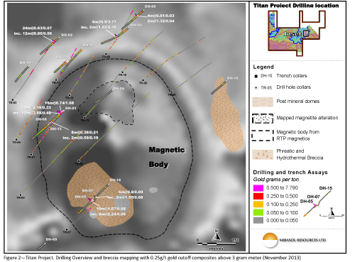 The Titan project is part of a large alteration system (Figure 1) outlined by ASTER satellite imagery and magnetic anomalies, and further delineated by recently completed extensions to ground magnetic surveys at the project. Other than Mirasol’s work at the Titan drill target, there has been no previous systematic exploration of this alteration system. Mirasol has recently expanded the Titan claim block from 4,312 to 5,515 hectares with the addition of contiguous claims that are part of Mirasol’s recently announced option agreement with a private Chilean company (Mirasol news release of June 26, 2013). Titan is located adjacent to Mirasol’s 100% owned Atlas gold silver project, where Mirasol reported encouraging gold and silver trench intersections from vuggy silica structures and hydrothermal breccias (Mirasol news release of September 16, 2013).