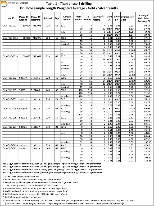 VANCOUVER, BC, November 25, 2013 — Mirasol Resources Ltd. (TSX-V: MRZ, Frankfurt: M8R) Mirasol is pleased to report results for its 15 hole, 3,218 metre reverse circulation (RC) drill program at its 100%-owned Titan gold project, in the prospective Miocene-aged gold — copper belt of northern Chile.