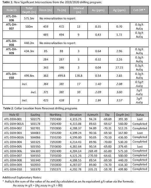 This news release reports on a total of 2,449.5m from five holes (ATL-DDH-06 to ATL-DDH-10). Three of these holes (ATL-DDH-006, 007 and 009) are wide step-out holes testing targets 1-2 km from the known central mineralized area and two (ATL-DDH-008 and 010) were drilled to test continuity within and to the south of the main mineralized zone.
