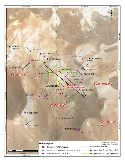 The latest round of drilling on the Atlas target, which is a large high sulfidation epithermal (HSE) system outcropping over 20 km2, brings the total drilling to 15,925m in 35 holes by both Newcrest and a previous partner and demonstrates widespread mineralization within the central breccia complex. Results to date suggest that the Atlas HSE system is comparable in aerial extent to other economic systems in the area, such as Salares Norte (Gold Fields), Alturas (Barrick Gold) and La Coipa (Kinross Gold). Additionally, lithochemical studies on drill samples indicate that the geochemical footprint of the system, which appears to NW and NE show structural controls, is larger than the area covered by the drilling to date and is open to the north, east and southwest.