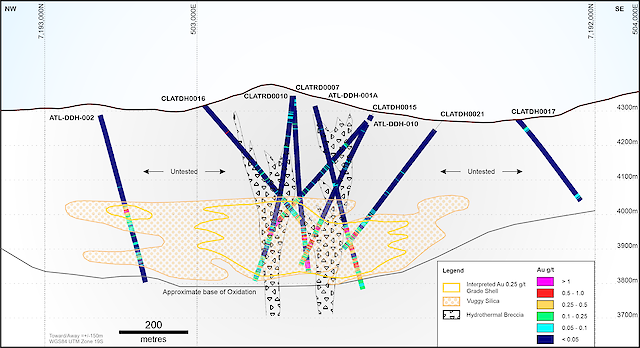 Hole ATL-DDH-010 intersected a broad zone of mineralization over a width of 128.8 m starting at 363m down hole, including 17m at 1.4 g/t Au (364-381m), also including 10m of 2.09 g/t Au (371-381m). This suggests the continuity of the mineralized zone for over 300m between the previous intersections in holes CLATDH0015 and ATL-DDH-001A. The mineralization occurs in strongly altered porphyritic andesites and hydrothermal breccias with vuggy silica textures, strong silicification and quartz alunite alteration.