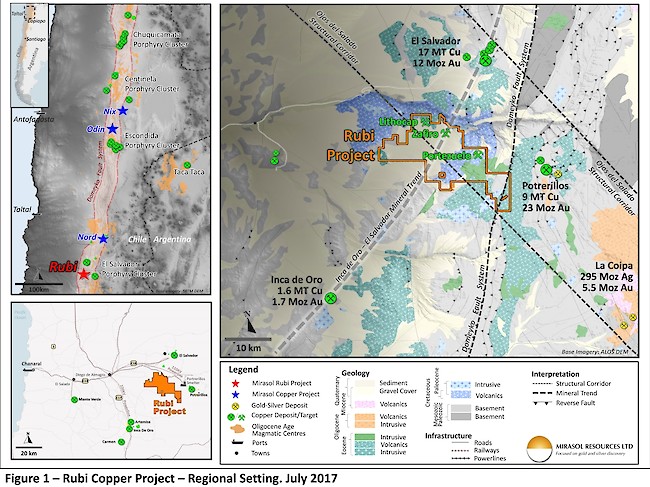Vancouver, BC, 24 July, 2017 — Mirasol Resources Ltd. (TSX-V: MRZ, OTCPK: MRZLF “Mirasol”) is pleased to announce that it has defined three large-scale porphyry Cu-Mo-Au targets, and also expanded its claim holdings, at its 100% owned Rubi Project (“Rubi”) situated adjacent to the giant El Salvador copper mining district in northern Chile.