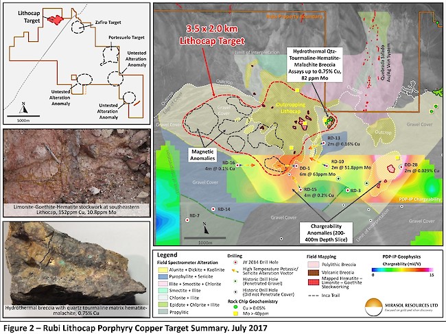 Mirasol recently completed field evaluation and targeting programs at Rubi identifying three large-scale Cu-Mo- Au targets at the Lithocap, Zafiro, and Portezuelo prospects (Figure 1). The targets were defined by integrated analysis, including re-logging of drill holes and the re-interpretation of geophysics and geochemistry from previous Joint Venture (JV) partner exploration at Rubi. This was combined with recent Mirasol geological mapping, rock chip sampling and target vector modelling from field-based measurements of alteration minerology.