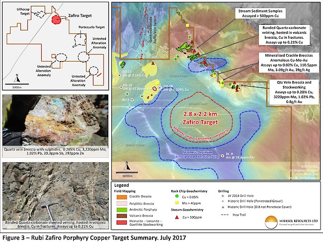 The Zafiro prospect (Figure 3) features a 2.8 km by 2.2 km gravel covered area characterized by a subtle circular magnetic high surrounded by an incomplete, doughnut-shaped magnetic low. This magnetic signature may be indicative of a large gravel-covered intrusive with an alteration halo. The gravel cover in this area ranges from approximately 25 m to more than 200 m in thickness concealing the central target area. However, a large canyon 1 km to the north of the target cuts through the gravel profile exposing the basement rock. Mirasol’s stream sediment sampling of gullies that traverse this area have returned widespread strongly anomalous Cu up to 1,030 ppm (0.1%), suggesting either an “exotic” source of copper in the gravels and / or a primary porphyry source for the Cu in the gravel-covered basement of the Zafiro prospect.