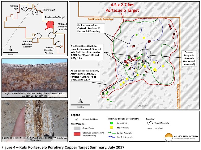 At the Portezuelo prospect (Figure 4), the 4.5 km by 2.7 km target area is characterized by relatively thin gravel cover and intermittent outcropping. Analysis of Mirasol and previous JV partner data shows widespread anomalous Cu and Mo in soils, spatially associated with an oval-shaped magnetic feature that may represent a partially gravel-covered intrusive complex. Strongly oxidized, porphyry-like stock-works and sheeted veining with anomalous Mo and Cu, is locally exposed in road cuts and has been recently identified by Mirasol outcropping in creek beds in the north of the target area.