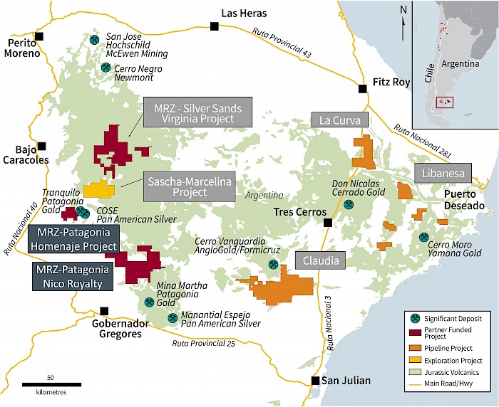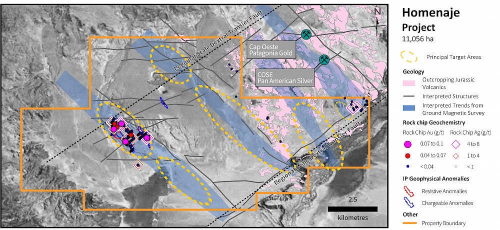 The Homenaje project covers 10,056 ha and is located at the western margin of the Deseado Massif Au-Ag metallogenic province, just 3km south and southwest from the COSE and Cap Oeste mines operated by Pan American Silver and Patagonia Gold, respectively.