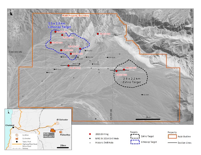 VANCOUVER, BC, November 8, 2021 — Mirasol Resources Ltd. (TSX-V: MRZ) (OTCPK: MRZLF) (the “Company” or “Mirasol”) reports on the results from a diamond drill program completed at the Rubi porphyry Cu project (“Rubi”) in Chile, under an option agreement with Mine Discovery Fund (“MDF”). Drilling focused on the Lithocap and Zafiro targets, with results clearly indicating the presence of a large and strong prospective porphyry-style alteration system. MDF has confirmed their continued commitment to the project and a deep sensing Induced Polarization (“IP”) and magnetotellurics (“MT”) geophysical program is planned to help focus follow-up drilling on better mineralized porphyry targets.