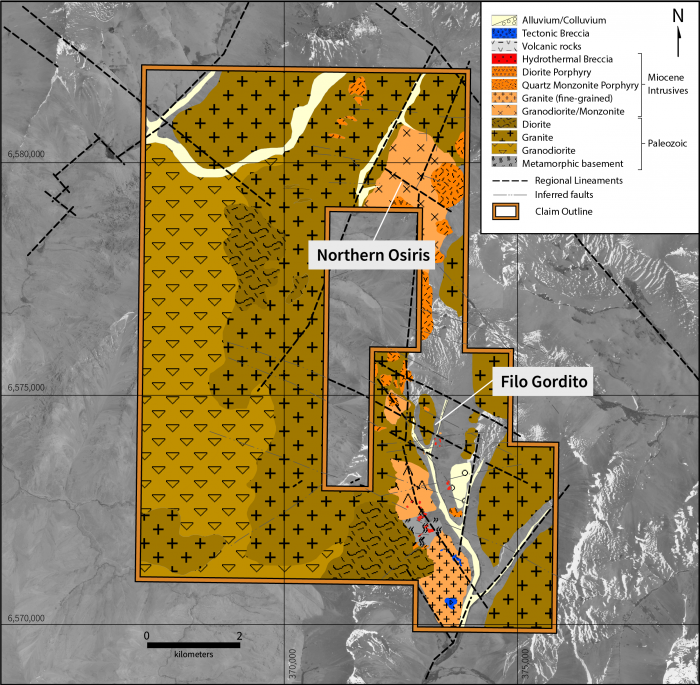 At a project scale Osiris is characterized by Paleozoic biotite migmatites and weakly foliated diorite lithologies, which have been cross-cut by Carboniferous-Permian-Triassic intrusives and several diorite dykes (Figure 2). Mineralization is interpreted to be associated with Miocene aged (13.7 Ma) diorite to rhyolite porphyritic intrusives and structurally controlled magmatic-hydrothermal breccias associated with west-northwest and north-northwest regional structures. The long-lived magmatism, multi-phase porphyritic intrusives together with the observed structural preparation is considered highly favourable for porphyry Cu-Mo-(Au) mineralisation.