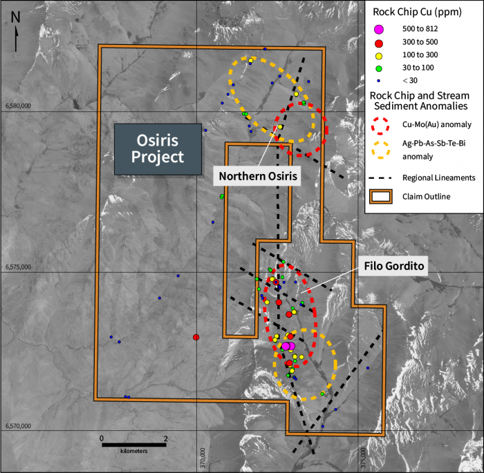 Cu-Mo-(Au) rock chip geochemistry (Figure 3) and alteration spectral analysis have defined two targets, at the Filo Gordito and Northern Osiris, with Cu mineralization occurring as supergene oxides developed from primary chalcopyrite. Peripheral to these two targets, geochemical surveys have also defined epithermal polymetallic Ag-As-Sb-Te-Bi-Pb±Au anomalies. In addition, on the southeast part of the Filo Gordito target, a large 3 x 2 km phyllic alteration footprint affects porphyritic units and intrusive breccias. The intrusive breccia has strong quartz-sericite alteration, which is cut by quartz sericite veins (D-style porphyry veins). This phyllic alteration, locally displaying an alunite overprint, is considered to be typical of a porphyry environment and may represent the mid-upper levels of the system and vectors to potentially higher Cu-Au grades within the deeper and underlying the potassic zone.