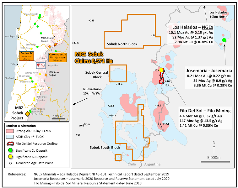 A new mineralized district is developing in the Sobek area with multiple deposits located in close proximity, including the Josemaria and Los Helados porphyry Cu-Au deposits located 10 km east-northeast and 20 km north of Sobek, respectively. Mirasol now controls 8,571 ha of exploration claims in this district in three blocks that are all on the Chilean side of the border with Argentina.