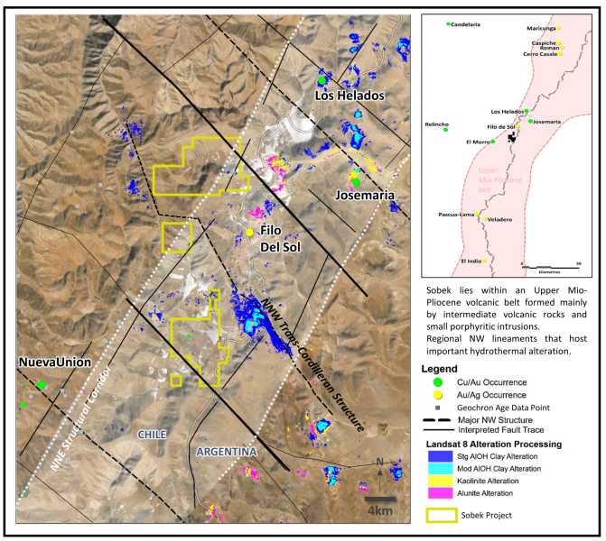 VANCOUVER, BC, November 4, 2021 — Mirasol Resources Ltd. (TSX-V: MRZ) (OTCPK: MRZLF) (the “Company” or “Mirasol”) is pleased to introduce the Company’s 100%-owned Sobek Cu project (“Sobek”) in Chile. Sobek was staked by Mirasol based on prospective local structural architecture with an important north-northeast trending mineralized structural corridor crosscut by north-northwest trending deep seated trans-cordilleran lineaments. The Sobek property land position was recently expanded following significant results reported by Filo Mining Corp. from its Filo del Sol project, which included a remarkable intercept of 858m at 1.80% CuEq (including 163m at 5.43% CuEq)[1]. Sobek is located 7 km to the west of the Filo del Sol project, a mid-Miocene epithermal - porphyry Au-Cu deposit.