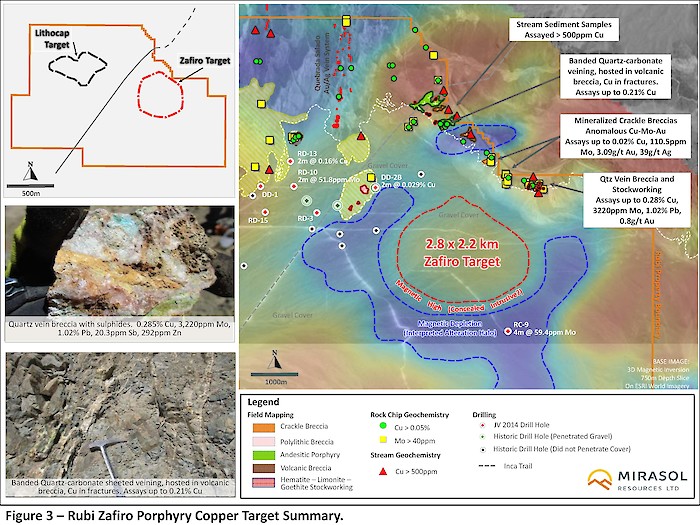 The Zafiro target (“Zafiro”) features a 2.8 km by 2.2 km gravel covered area characterized by a subtle circular magnetic high surrounded by an incomplete, doughnut-shaped magnetic low. This magnetic signature may be indicative of a large gravel-covered intrusive with a pyritic alteration halo. The gravel cover in this area ranges from approximately 25 m to more than 200 m in thickness concealing the central target area. However, a large canyon 1 km to the north of the target cuts through the gravel profile exposing the basement rock. Mirasol’s stream sediment sampling of gullies, located immediately north/northwest of the Zafiro target, have returned widespread and strongly anomalous copper over 2,400 m with multiple results in the 500 ppm to 1,530 ppm range, suggesting either an “exotic” source of copper in the gravels and/or a primary porphyry source for the copper in the gravel-covered basement.